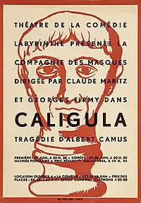Called up on the outbreak of war, Piero initially managed to stay in Milan by procuring the job of decorating the Sant'Ambrogio barracks.[18] Later, in 1943, he took refuge in Switzerland, where he continued his artistic research and produced posters and lithographs for theatrical events and magazines.[19] This period represented an unprecedented opportunity for him, during which he created oil portraits, watercolours, drawings in Indian ink, ink and ballpoint pen, devoting himself to the study of the human body, which he would later draw on in his production of decorative graphic arts. During the same period he created the sets and some promotional materials for Albert Camus' Caligula directed by Giorgio Strehler.