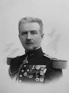 On 28 August 1914, in the battle of La Besace (Ardennes), he was seriously wounded in the jaw by a bullet while charging the Germans.[9] This action earned him a mention in the army order: "Well behaved in combat on 28 August 1914, brilliantly charged with the bayonet at the head of his section, was seriously wounded".[10] In 1916, he was posted to the Armée d'Orient, and became a captain in the Zouaves in 1917.[11][12][13]