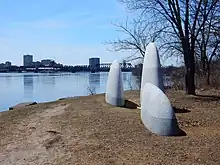 His exhibitions are named after the sea and the usual (wind, boats) or unusual experiences that he has had with it.[1] He has exhibited his work in many galleries and museums, including a group show at the Pointe-à-callière, Montréal archaeology and history complex with Gilles Vigneault (1995)[4] and solo shows at Gallery UQAM titled Pierre Bourgault: L'horizontale imaginee (2007)[6] and at the Center d'artistes Vaste et Vague in Carleton-sur-Mer titled Time Tremor (2016).[7] His sculpture is in such public collections as the Musée national des beaux-arts du Québec.[8]