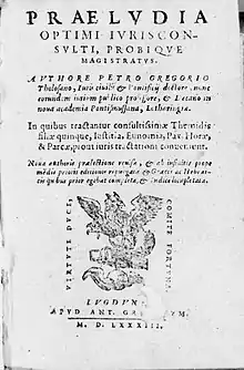 In his De Republica he expresses political views in favour of monarchy, and uses the analogy of family and state. His faculty was dominated by Jesuits, and Grégoire turned away from the policies of the Catholic League.[1] A critic of Machiavelli and not a conventional Gallican, he drew on both Jean Bodin and François Hotman, for an eclectic moderate Catholic position supporting the papal deposing power restricted to the Holy Roman Emperor, and the publication in France of the Tridentine decrees.[2]