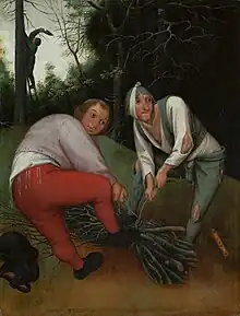 As Pieter Brueghel the Younger did not always have access to the original paintings of his father he would in fact often rely on prints of his father's work to create his derived compositions.[11] He also had access to (now lost) compositional drawings and intermediary cartoons which his father had made and then transferred to panels using pouncing.[25] His work is often the only source of knowledge about works of his father that are lost.[11] One example of just such a work is the Two Peasants Binding Firewood, of which several autograph versions exist (Barber Institute of Fine Arts; Private Collection), alongside various studio productions and even copies made outside the Brueghel workshop, which seems to preserve a now-lost original composition by the Elder Bruegel.[26]
