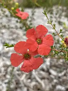 The upright and slender shrub typically grows to a height of 1 metre (3.3 ft). It blooms between September and November producing red flowers.[1] The woody shrub has prominent oil glands and lives between 5 and 10 years. The twiggy branchlets are covered in small hardy evergreen leaves.[2]