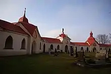 On the 17 July 1784 the roof of the church and its ambulatory caught fire.[3] Fortunately local citizens with great help of Matěj Sychra managed to save it from complete destruction. Permission to restore the church was given by the gubernium (administrative unit) in 1792 with the conditions that the church would no longer be a pilgrimage church, and that the cemetery of Žďár nad Sázavou would be moved to the church area.[3] Nowadays, the cemetery is no longer in use and is in fact being slowly moved out, to give the place the original look as it had in baroque times.[3] The church became a property of the state in 1953, but was returned to the Catholic Church in 2014.[3]