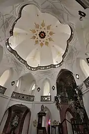 The church, with many furnishings designed by Santini himself, is remarkable for its gothicizing features and complex symbolism, quite unusual for the time. In 1994, it was declared a World Heritage Site.[1] The nomination dossier pointed out Santini's mathematical ratios in its architecture which aimed at "the creation of an independent spatial reality", with "the number 5 being dominant in the layout and proportions" of the church.[1][2]