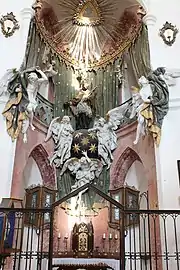 The main altar on eastern side is placed into high arcade. The peak of the altar reaches to the railing on the gallery on the second floor. Carving of five angels on the main altar (with its count five pointing to John of Nepomuk) and four evangelists are made by hands of a sculptor coming from Chrudim named Jan Pavel Čechpauer in years 1725–27. Three of five angels are bearing a sphere standing for heaven sky decorated with five stars. On the sphere stands figure of St. John of Nepomuk. The sculpture is a work of Řehoř Theny. He made also the reliefs on the litter for the silver pilgrimage statue of St. John of Nepomuk from year 1729 made by prague goldsmith Jan Diesbach. This statue disappeared after year 1784. The choice of contacting sculptors close to Matthias Braun was on purpose because Santini collaborated on his realizations many times actually with Braun whose 'sculpture language' was apparently very close to Santini's personality.