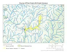 Pine Creek is a 13.8-mile (22.1 km)[5] long tributary to Oil Creek in Crawford County, Pennsylvania. Most of Pine Creek and its tributaries are classed as Exceptional Value (EV) or High-quality-Cold Water Fishery (HQ-CWF). Only the lowest part of Pine Creek near Oil Creek is classed as a cold-water fishery.[6]