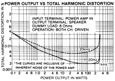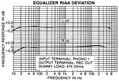 Apart from its high output power capability, the Pioneer SX-1980 had quite advanced performance in many other important areas. The THD versus frequency response curve showed very low distortion levels over a wide range of operating conditions. Phono cartridge load selectors allowed the user to select from three input resistances (10, 50, and 100 kΩ) and four input capacitances (100, 200, 300, and 400 pF). The RIAA equalisation was accurate to within ±0.2 dB from 20 Hz to 20 kHz (tested as ±0.1 dB[4]), and a high-accuracy performance specification such as this is not often achieved, even today.