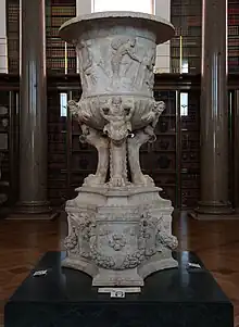 The upper part is in the style of the Borghese Vase. The lower part, which was not original, was influenced by the Torlonia Vase, a celebrated neo-Attic Roman marble from the collection of Cardinal Albani. It similarly stands on three lions' legs which in the case of the Torlonia Vase were 16th-century additions.[1]
