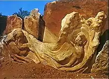 The Pitchi Richi Sanctuary, just south of Heavitree Gap, is set on 12 acres (4.9 ha) of land that were purchased by Leo Corbet in 1955 following the death of Charles 'Pop' Chapman, an eccentric Alice Springs legend, who had named the property 'The Pearly Gates'. It is not known exactly when Corbet changed the name to Pitchi Richi but he told a friend "the Pearly Gates might seem a bit presumptuous coming from me".[2] The name Pitchi Richi is (loosely) derived from the Arrernte language and it is said to mean "come and look"[2] and also "gap in the range".[3] William Ricketts, a close friend of Corbets, built a kiln on the site shortly after it was purchased and his sculptures were displayed from the time that the sanctuary opened.