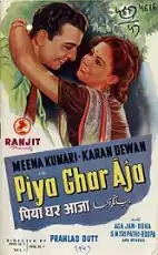 Piya Ghar Aaja is an Indian film directed by Prahlad Dutt and starring Meena Kumari, Karan Dewan, Saroj, Agha Jaan and Mohantara Talpade.[1] Meena Kumari also lent her voice for playback and sang seven songs in this film.[2] The film was released on April 23, 1948. Incidentally, the film’s original title was "Jalan".