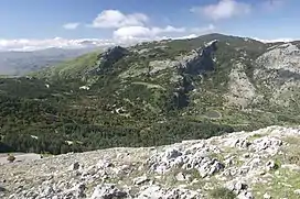 Pizzo Carbonara is located about 10 km NW of Petralia Sottana. It is a limestone massif, and rainwater falling on it eventually emerges at the foot of the castle rock of Cefalù on the north coast of Sicily. Its summit is more of a plateau than a peak, so that it is not easy to determine the highest point.