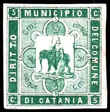 At the end of 1873, Torres sent the municipality of Catania proofs of a set of revenue stamps that he had prepared for their use. They show an elephant as appears in the coat of arms of the municipality.[11] Torres and his collaborators began to sell the stamps to collectors without waiting for the municipality to approve them,[11] and when Le Timbre Fiscal revealed in Spring 1874[12] that the stamps were not approved, he was obliged to offer to buy back those he had sold in advance.[11] The main distribution of the stamps, however, had been by Bonasi and his wife, and they were not disposed to refund anyone. There was also the additional fraudulent sales of fakes by Bonasi in Italy and elsewhere. In the ensuing scandal, Torres relocated his shop and cancelled the next issue of his magazine.[11] Finally, in an attempt to clear his name,[11] he published a pamphlet I Moderni Cagliostri od i conti A. Candrini e G.C. Coniugi Bonasi[13] (A Modern Cagliostro), condemning the activities of Bonasi and his wife which brought an end to his relationship with them and Usigli. At the end of 1874, Torres returned to Spain.[11]
