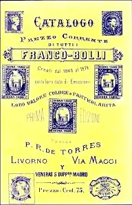 In 1873,[7] Torres successfully published his first catalogue which went through two more editions. The first edition, in common with many other early stamp catalogues, was not illustrated except for on the cover. In July that year, he also began to publish the stamp collecting journal La Posta Mondiale which offered stamps for sale, a lithographed page of the stamps discussed in the journal, and correspondence from collectors. Packets of mixed stamps were offered as well as special arrangements for other dealers.[8] The focus of the magazine was on Italy and Spain with a significant amount of coverage of revenue stamps,[8] too much in the opinion of The Stamp-Collector's Magazine, who otherwise welcomed the magazine, but commented that the less said of its coverage of Italian revenues and municipal stamps, the better.[9] He established a philatelic club in his premises where collectors could meet.[8]