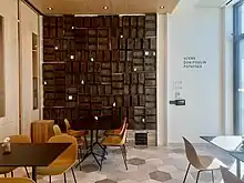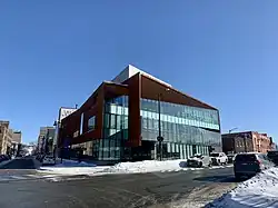 Place des Arts is situated on the corner of Larch and Elgin Street in Downtown Sudbury and is in close proximity to many local businesses and community organizations such as the YMCA, Sudbury Community Arena and the McEwen School of Architecture.[4] The 40,000 square-foot building contains a 300-seat theater, a multi-use performance space, a contemporary art gallery, a library with a national publishing house, a boutique, offices, a daycare and a bistro with a seasonal terrace.[5] The building’s facilities can be rented by the community, thus it hosts a variety of public and private events including theater productions, jazz nights and work events.
