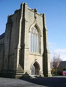 The tower and steeple of the church were listed Grade II.[32] The tower has been described by English Heritage as being of coursed squared sandstone in a square planned perpendicular style. It had angle buttresses, a vice at the north-east corner, an offset to the belfry stage and an embattled parapet. The spire was splay-footed with lucarnes in the non-cardinal sides. The east side of the tower had a moulded Tudor-arched doorway which led to the former nave. The structure was de-listed on 14 September 2001.