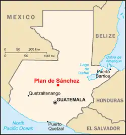 The Plan de Sánchez massacre took place in the Guatemalan village of Plan de Sánchez, Baja Verapaz department, on 18 July 1982. Over 250 people (mostly women and children, and almost exclusively ethnic Achi Maya) were abused and murdered by members of the armed forces and their paramilitary allies.