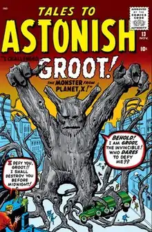- ↑ Lee, Stan (w), Kirby, Jack (p), Ayers, Dick (i). "I Challenged... Groot! The Monster from Planet X!" Tales to Astonish, no. 13 (November 1960).