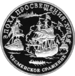 Reverse: three sailing ships and a boat at the Battle of Chesma, around: "Age of Enlightenment. 18th century.", bottom: "Battle of Chesma" Design: A.V. Baklanov Mint: Leningrad Mint (LMD). 240 indents on the rim.[3] |