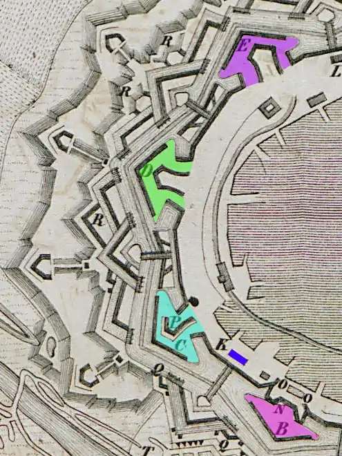 Details from the Siege Plan of 1744 (today's buildings in brackets):