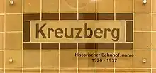 The station opened on 14 February 1926 and was then called Kreuzberg (after the hill which gives the district its name; it is on the edge of the district).[5] Two old wall signs with that name, uncovered in renovation, have been preserved under glass. It was the terminus of Line CII (today U6) until the opening of Paradestraße station on 10 September 1927. The latter was originally called Flughafen (Airport). However, in 1937 that station received its current name and the Kreuzberg station was renamed Flughafen.[1] It had a direct connection to Tempelhof Airport, at that time unique in the world;[6] it remained the connection between the airport and the city's public transport system until the airport closed in October 2008.