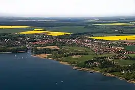 With an area of 38.4 km2, the Plauer See is the third largest lake in Mecklenburg-Vorpommern and the seventh largest in Germany. It has a north–south extension of around 14 kilometres, a maximum width of 5 kilometres and an average depth of 6.8 metres.[3] It has connections via the Elde to the Fleesensee, the Kölpinsee and the Müritz in the east and to the river Elbe in the west. On the western shore of the Plauer See lies the eponymous town of Plau am See, which is also the centre of tourism in this region. There are many tourist facilities around the Plauer See, such as the camping sites located on the eastern and northern shores, near the town of Plau and on the island of Plauer Werder in the north. The lake is surrounded by a (largely still unpaved) circular cycle path.