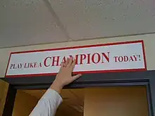 Play Like a Champion Today is a saying written on a sign created by Coach Bud Wilkinson of the University of Oklahoma Sooners in the 1940s to inspire the players as they entered Owen Field. It is located overhead in the tunnel leading out to the field in the south end zone at Oklahoma Memorial Stadium. The University of Notre Dame Fighting Irish football program later began using the saying as well.[1]