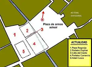 When the Spaniards arrived in Cusco, they stayed in the Inca palaces around the square.[15] Later, they built viceroyal mansions, cathedrals, temples and chapels over the Inca palaces. In 1545 the chief magistrate Polo de Ondergardo ordered the removal of the beach sand that was on the floor of the square to use it in the construction of the Cusco Cathedral.[16] In 1555, the chief magistrate of Cuzco, Sebastián Garcilaso de la Vega authorized the construction of buildings in the middle of the Huacaypata thus generating the blocks currently located between Calle Espaderos, Calle Del Medio, Calle Mantas, Calle Heladeros and Calle Espinar as well as the current Plaza de Armas, Plaza Regocijo, Plaza Espinar and the Hotel de Turistas which, during the Viceroyalty served as the Casa de Moneda.[17]