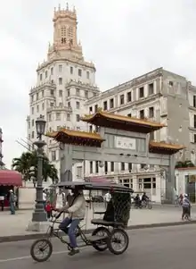 The district has two paifang,[24][lower-alpha 2] the larger one located on Calle Dragones. The long-neglected Chinatown in Havana, Cuba, received materials for its paifang from the People's Republic of China as part of the Chinatown's gradual renaissance.[25] China donated the materials in the late 1990s.[26] It has a well defined written welcoming sign in Chinese and Spanish. The smaller arch is located on Zanja strip. Cuba's Chinese boom ended when Fidel Castro's 1959 revolution seized private businesses, sending tens of thousands of business-minded Chinese fleeing, mainly to the United States. Descendants are now making efforts to preserve and revive the culture.[10] Many of the businesses in the Plaza del Vapor were operated and owned by Chinese Cubans.