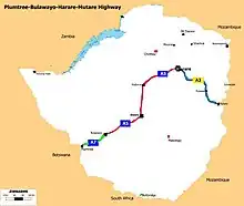 The Plumtree-Bulawayo-Harare-Mutare Highway is a cross country international standard highway in Zimbabwe. It connects Mutare with Plumtree via Harare and Bulawayo. It is formed by two routes, namely the R5 Road (Mutare - Harare) and the R2 Road (Harare - Plumtree).