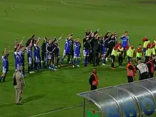 Podbeskidzie players celebrate winning promotion to the Ekstraklasa in 2011