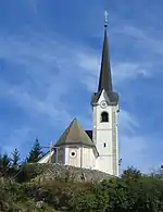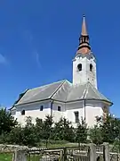 The picturesque fortified Tabor Church, in the hamlet of Podtabor on a rock above the motorway from Ljubljana to the Karawanks Tunnel, is a well-known landmark on the route. It was built some time soon after 1471 as a fortification where the locals could escape from Ottoman raids. The worst Ottoman incursions across Upper Carniola and into Carinthia were in 1476 and 1477. The building of the walls around the church was conditioned by the favourable natural position on an elevation in the middle of a plain, affording a view in all directions. The walls surrounding the church are irregularly shaped and were built on two levels with a roofed walkway, balistraria, and defense tower. The defence tower overlooked the only entrance over a drawbridge. On the western side the church was fortified with a moat and dike. This was also where valuables, food, and livestock were kept.[6] The church is dedicated to Saint Benedict and Our Lady of Sorrows.[7] One of the paintings in the church is by Ivana Kobilca, who lived in the village for a while.[8]
