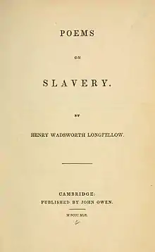 Poems on Slavery is a collection of poems by American poet Henry Wadsworth Longfellow in support of the United States anti-slavery efforts. With one exception, the collection of poems were written at sea by Longfellow in October 1842.[1] The poems were reprinted as anti-slavery tracts two different times during 1843.[2][3] Longfellow, very conscious of his public persona, published the poems even though he feared it would hurt him commercially. At the time of publication reviews were mixed,[4] but more recently critics (now less bothered by what was earlier done away with as mere sentimentality) have begun to appreciate the collection again, for its political message and for its rhetorical strategies.[5]