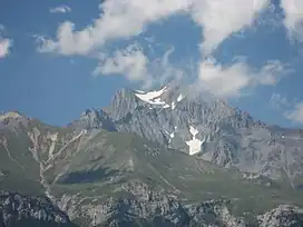 ![]() Southern face of Pointe de la Fournache (left) and Dent Parrachée (right) in the background, separated by a small cirque glacier | |