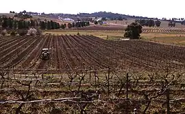 Viticulture in the Hunter Valley is often considered to have commenced with James Busby. In the 1820s he studied oenology, wrote a treatise and guidance manual on the subject and briefly taught viticulture at a Liverpool farm school. In 1831 he undertook a tour of French and Spanish vineyards which resulted in two published journals of the trip.[12] He returned with 570 cuttings of which 363 survived carefully wrapped in moss, sand and soil.[13] Half went to the newly established Royal Botanical Gardens in Sydney. The rest he took with him to the family estate of Kirkton, just north of Belford on the Hunter river run by his brother-in-law William Kelman. Also in 1828 George Wyndam planted vines at his Dalwood estate with the first shiraz being planted there in 1830.[14] The Drayton family established a vineyard at Pokolbin around the late 1850s and the Tyrrells Estate was set up in 1859 with Frederick Wilkinson planting vines at Oakdale in 1866. After the Robertson Land Act was introduced in 1861 the way was opened for small landholders and more people began to settle in the Rothbury/Pokolbin area.[12] The main farming activities were wheat, tobacco, dairy and grapes. By the 1930s the area was known for producing quality wines.