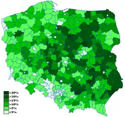 The Party's traditional support base consisted of farmers, peasants and rural voters. Voters are generally more social conservative than voters of Civic Platform.[65] Its main competitor in rural areas is the national conservative Law and Justice (PiS).[66]