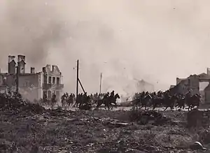 The origin of the photograph was clarified after it was noticed that some of the buildings, uniforms and saddles in the photo match buildings and equipment of soldiers seen in the 1941 German propaganda movie Kampfgeschwader Lützow.[14] The Polish soldiers in Kampfgeschwader Lützow were played by Slovaks and their uniforms and saddles closely match those used by the Slovak army at the beginning of WWII.[1][4] The scene of the charge of "Polish cavalry" in the movie was shot around Wyszków in 1940.[15][16] Also, many scenes from the movie were linked to specific locations in that town.[17] The photograph is not a still from the movie, but it was likely taken during its shooting.[1]