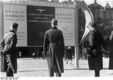 In March 1940, all cultural activities came under the control of the General Government's Department of People's Education and Propaganda (Abteilung für Volksaufklärung und Propaganda), whose name was changed a year later to the "Chief Propaganda Department" (Hauptabteilung Propaganda).[10] Further directives issued in the spring and early summer reflected policies that had been outlined by Frank and Goebbels during the previous autumn.[11] One of the Department's earliest decrees prohibited the organization of all but the most "primitive" of cultural activities without the Department's prior approval.[7][10] Spectacles of "low quality", including those of an erotic or pornographic nature, were however an exception—those were to be popularized to appease the population and to show the world the "real" Polish culture as well as to create the impression that Germany was not preventing Poles from expressing themselves.[11] German propaganda specialists invited critics from neutral countries to specially organized "Polish" performances that were specifically designed to be boring or pornographic, and presented them as typical Polish cultural activities.[12] Polish-German cooperation in cultural matters, such as joint public performances, was strictly prohibited.[13] Meanwhile, a compulsory registration scheme for writers and artists was introduced in August 1940.[7] Then, in October, the printing of new Polish-language books was prohibited; existing titles were censored, and often confiscated and withdrawn.[7]