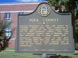 Polk County is a county located in the northwestern part of the U.S. state of Georgia. As of the 2020 census, the population was 42,853.[1] The county seat is Cedartown.[2] The county was created on December 20, 1851, by an act of the Georgia General Assembly and named after James K. Polk, the eleventh President of the United States.[3]