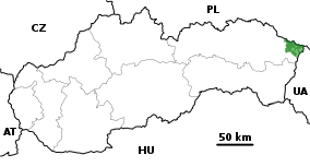 The park is located in the Snina District in the Prešov Region. It is adjacent to Bieszczady National Park in Poland, together they are part of the East Carpathian Biosphere Reserve. The highest point lies at 1,208 m (3,963 ft) AMSL on a point where the borders of Slovakia, Poland and Ukraine meet, near the summit of the mount Kremenec. The National Park is the easternmost and least populated area of the country. Hiking trails starts from several villages, most notably Nová Sedlica but also from Runina, Topoľa and Uličské Krivé.