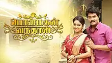 Ponmagal Vanthal (transl. Goddess of Wealth Appeared) is a Tamil-language family soap opera series starring Meghna Vincent, Vicky Krish, Shanoor Sana and Vandana Michael. It started airing on 26 February 2018 and ended at 1 February 2020 for 571 episodes on Vijay TV,[1] every Monday to Friday in an afternoon programming block called "Vijay Matinee Thodargal". Later the show was rescheduled to air Monday through Saturday.[2][3] The series marks the debut Tamil-language television series for Ayesha of Kerala, who plays the lead role, however she was replaced by Meghna Vincent after episode 105.[4] The series is directed by Gopal Shamugam.
