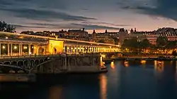 The Pont de Bir-Hakeim (French pronunciation: [pɔ̃ d(ə) biʁ akɛm]; English: Bridge of Bir-Hakeim), formerly the Pont de Passy ([pɔ̃ d(ə) pasi]; Bridge of Passy), is an arch bridge that crosses the Seine in Paris. It connects the 15th and 16th arrondissement, passing through the Île aux Cygnes. The bridge, made of steel, was constructed between 1903 and 1905, in replacement of a footbridge that had been erected in 1878. The bridge has two levels: one for motor vehicles and pedestrians, the other being a viaduct (the Viaduc de Passy) built above the first one, through which passes Line 6 of the Paris Métro. The bridge is 237 metres (777 ft) long and 24.7 metres (81 ft) wide. The part crossing the Grand Bras ('great anabranch') of the Seine (west from the island) is slightly longer than the one crossing the Petit Bras ('small anabranch').[1]