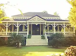 Joseph L. Harris acquired Poplar Grove Plantation in 1885.[6][2] The Poplar Grove Plantation manor house was part of the Banker's Pavilion at the 1884 World's Industrial and Cotton Centennial Exposition held in Audubon Park, New Orleans.[10][11] In 1886, the structure was purchased by Harris and moved by way of barge down the Mississippi River to Port Allen, Louisiana.[3][12]