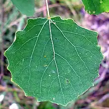 The bark on young trees is smooth and white to greenish or dark gray, and often has conspicuous lenticels; on old trees, it remains smooth in some species, but becomes rough and deeply fissured in others. The shoots are stout, with (unlike in the related willows) the terminal bud present. The leaves are spirally arranged, and vary in shape from triangular to circular or (rarely) lobed, and with a long petiole; in species in the sections Populus and Aigeiros, the petioles are laterally flattened, so that breezes easily cause the leaves to wobble back and forth, giving the whole tree a "twinkling" appearance in a breeze. Leaf size is very variable even on a single tree, typically with small leaves on side shoots, and very large leaves on strong-growing lead shoots. The leaves often turn bright gold to yellow before they fall during autumn.[2][3]