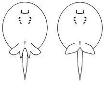 Almost circular in shape, it grows up to 40 cm (16 in) in disc width and 15 kg (33 lb) in weight.[3] The upper surface is covered with denticles (sharp tooth-like scales). The coloration is light brownish with mottled patterns on the dorso, and pink on the ventral side. As with all stingrays, the mouth and gill openings are on the underside, and the eyes and gills exits are on the dorsal side.