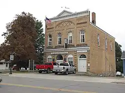 The Port Sanilac Masonic and Town Hall is a rectangular, two-story red-orange brick building on a fieldstone foundation. It has a front gable roof, hidden by a false front topped with an iron cornice. The main facade is divided into four bays by vertical brick piers. The bays have a broad, round-head sections, two of which have windows, and two of which have double doors. One set of doors leads to the first floor township offices, and the second to the upstairs Masonic lodge. The second floor facade has segmental-arch-head windows with slightly projecting two-course high brick hoods, with the original windows being two-over-two units. Dark brown bricks accent the second story of the facade.[3]