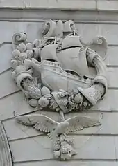 Throughout the building, there are numerous references to the sea and the maritime operations of both Liverpool and the British Empire. The main entrance gates are decorated with a globe supported by dolphins, while the cast iron gates and gate piers are decorated with mermaids, shells and anchors, and have shields with the initials "M.D. & H.B.".[18] The outside light fittings are designed such that the lights themselves appear to be held in the hands of the Roman God Neptune.[5] Similarly, the lifts are also decorated with maritime references, in the form of gilded emblems representing the globe, seahorses and anchors.[13] In the central hall, the frieze between the ground and first floor is adorned with the words of psalm 107: "They that go down to the sea in ships that do business in great waters these see the works of the Lord and his wonders in the deep. Anno Domini MCMVII".[13]