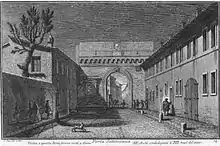 The last renovation, carried out by Pope Pius VI in 1798, maintained a military aspect - included with the guelph battlements - scarcely justifiable for a gate fully integrated into a city quarter.