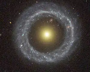 Hoag's Object is a ring galaxy, consisting of a symmetrical ring of young, hot blue stars surrounding a central nucleus of older yellow stars. The cause of its structure is not known: some galaxies of this time are formed by galactic collisions, but there seem to be no nearby candidates for the galaxy which collided with Hoag's Object. Credit: NASA and the Hubble Heritage Team