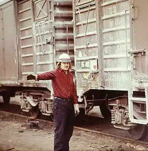 A brakeman gives hand signals to the engineer during a switching move in Dresden in 1981.