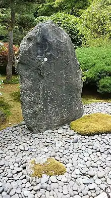The Garden Pavilion was built in 1980 in Japanese style by local builders: it has a tiled roof, wooden verandas, and Shōji sliding doors. It is the center of several Japanese cultural festivals, art exhibitions, and other events.[3] The west veranda faces the Flat Garden, and the east veranda overlooks downtown Portland and Mount Hood, which resembles Mount Fuji.[4] Dozens of stone lanterns (tōrō) are present throughout the garden. The lower entrance features a 100-year-old temple gate, a 1976 gift of the Japanese Ancestral Society of Portland Oregon.[2] The Iyo Stone was added to the garden in June 1968 to commemorate the 1963-1964 tenure of Philip Englehart, the Japanese Garden Society of Oregon's first president.[5]